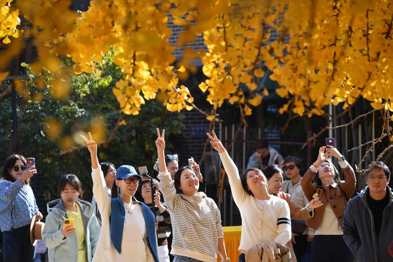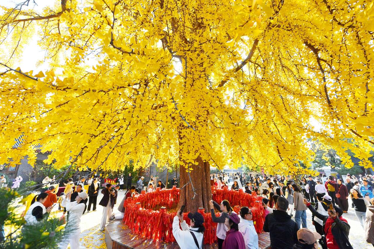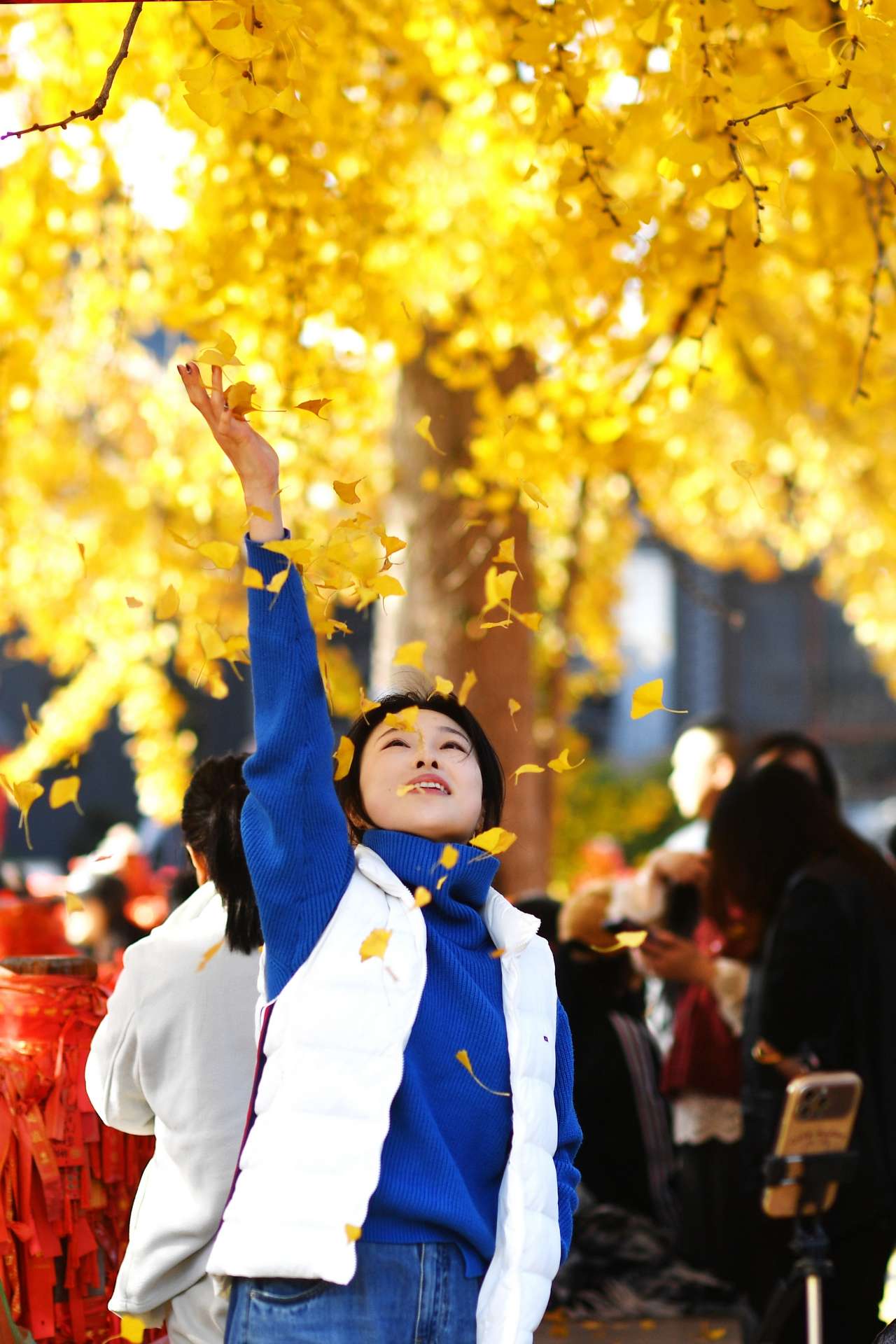 11月14日,在山东省青岛市城阳区夏庄街道法海寺的古银杏树下,游客在拍照打卡。