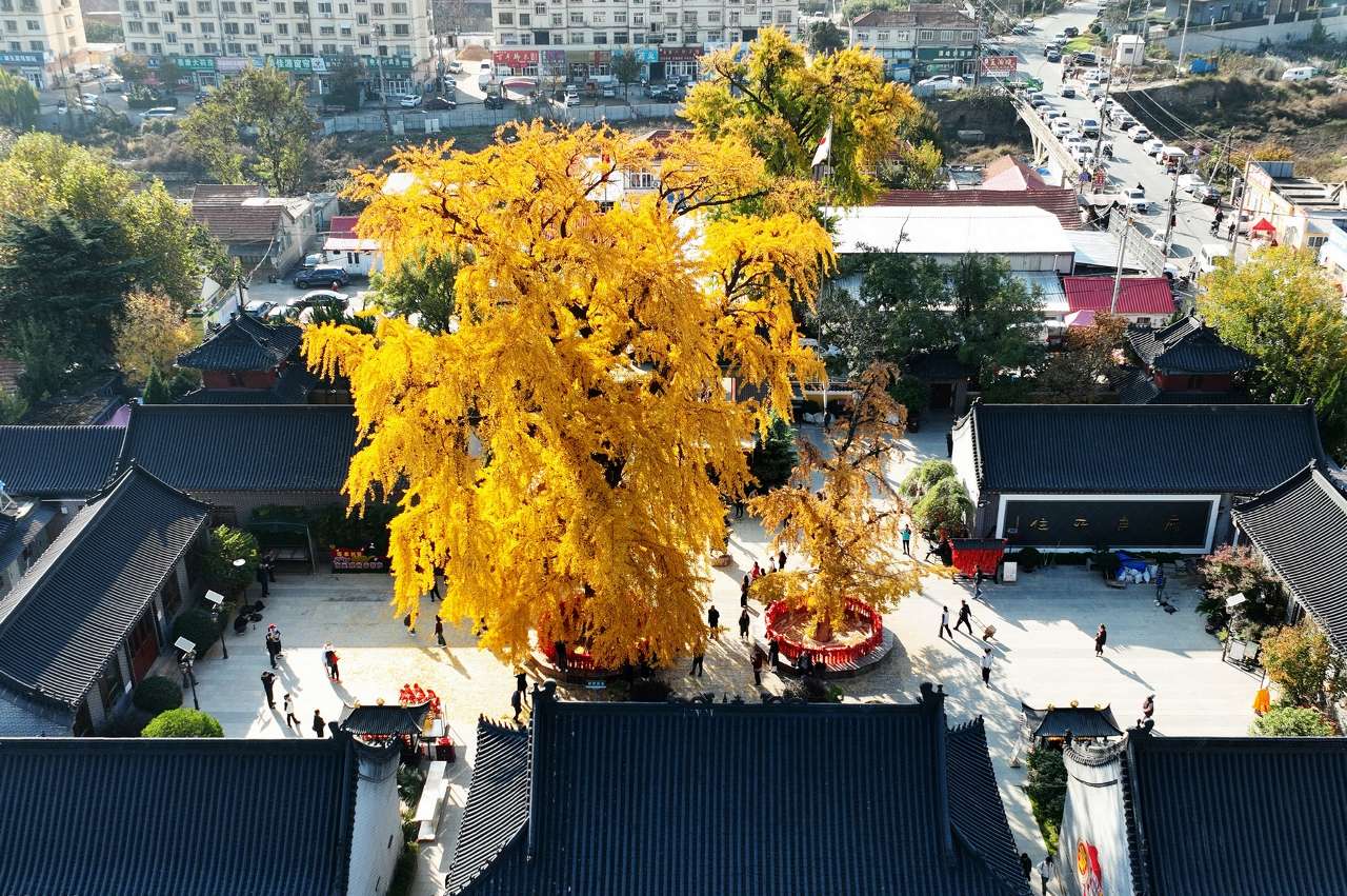 初冬时节杨方策略,在山东省青岛市城阳区夏庄街道法海寺,树龄约1600余年的古银杏树流光溢彩、熠熠生辉,吸引众多游客前来打卡观赏。