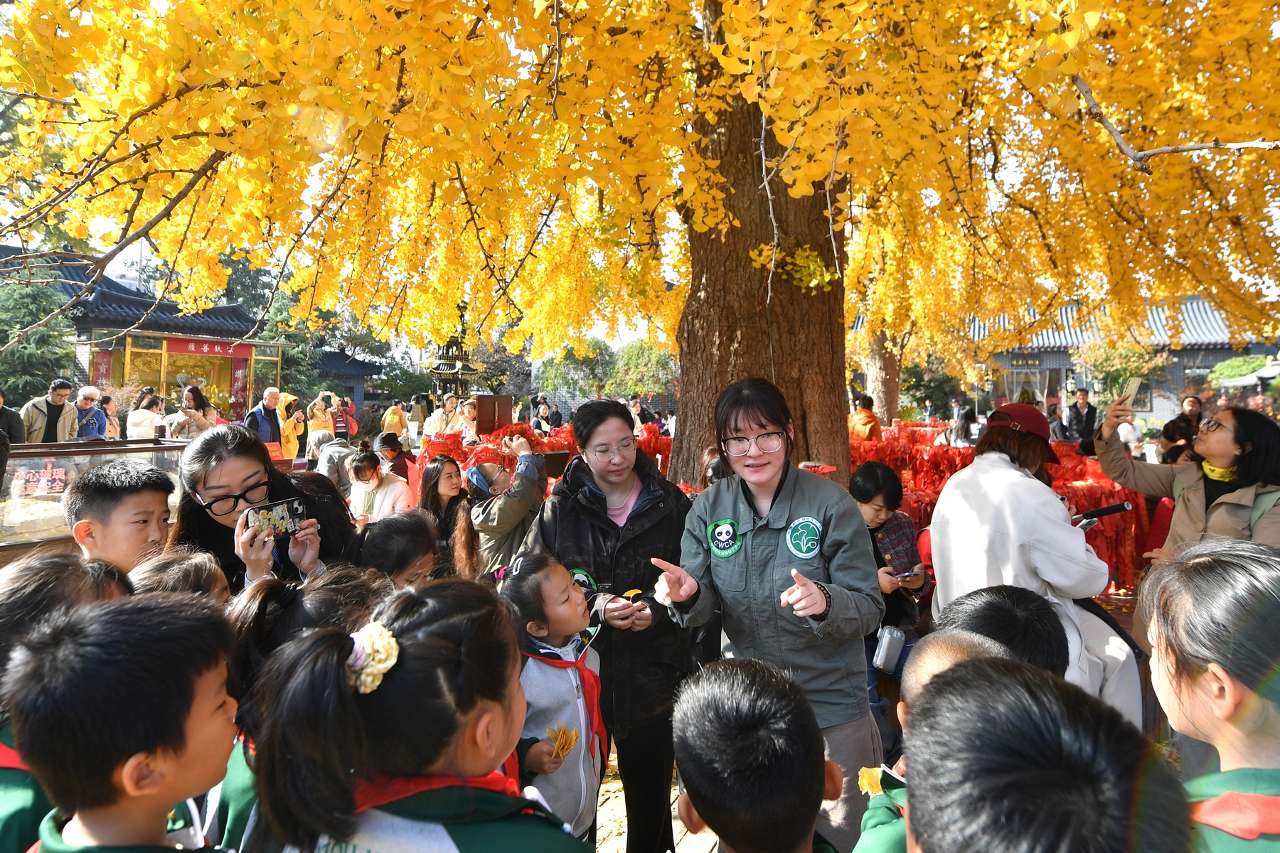 11月14日,在山东省青岛市城阳区夏庄街道法海寺的古银杏树下,城阳区野生动植物保护志愿者在为学生做科普。